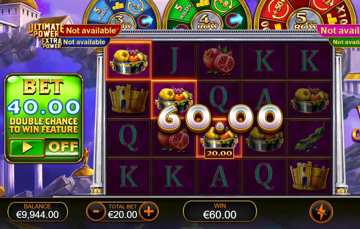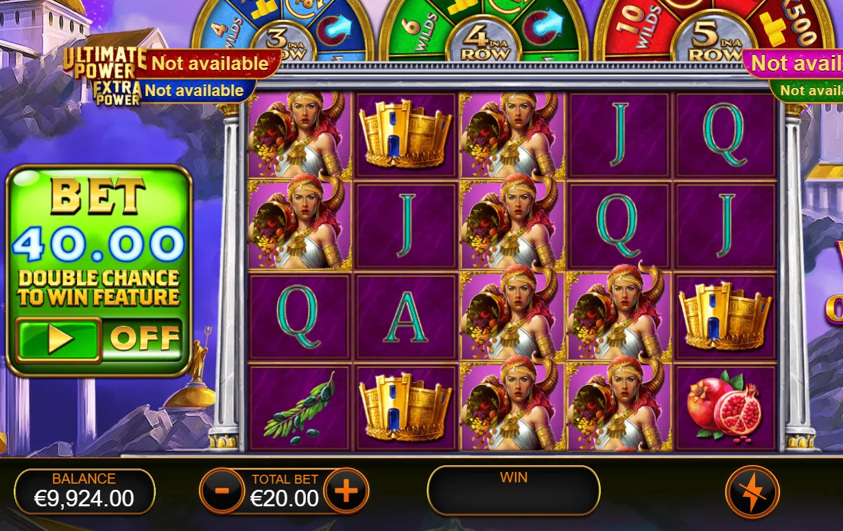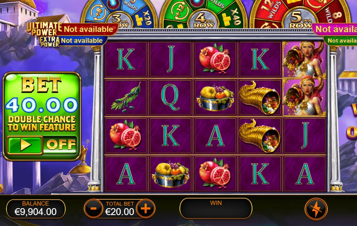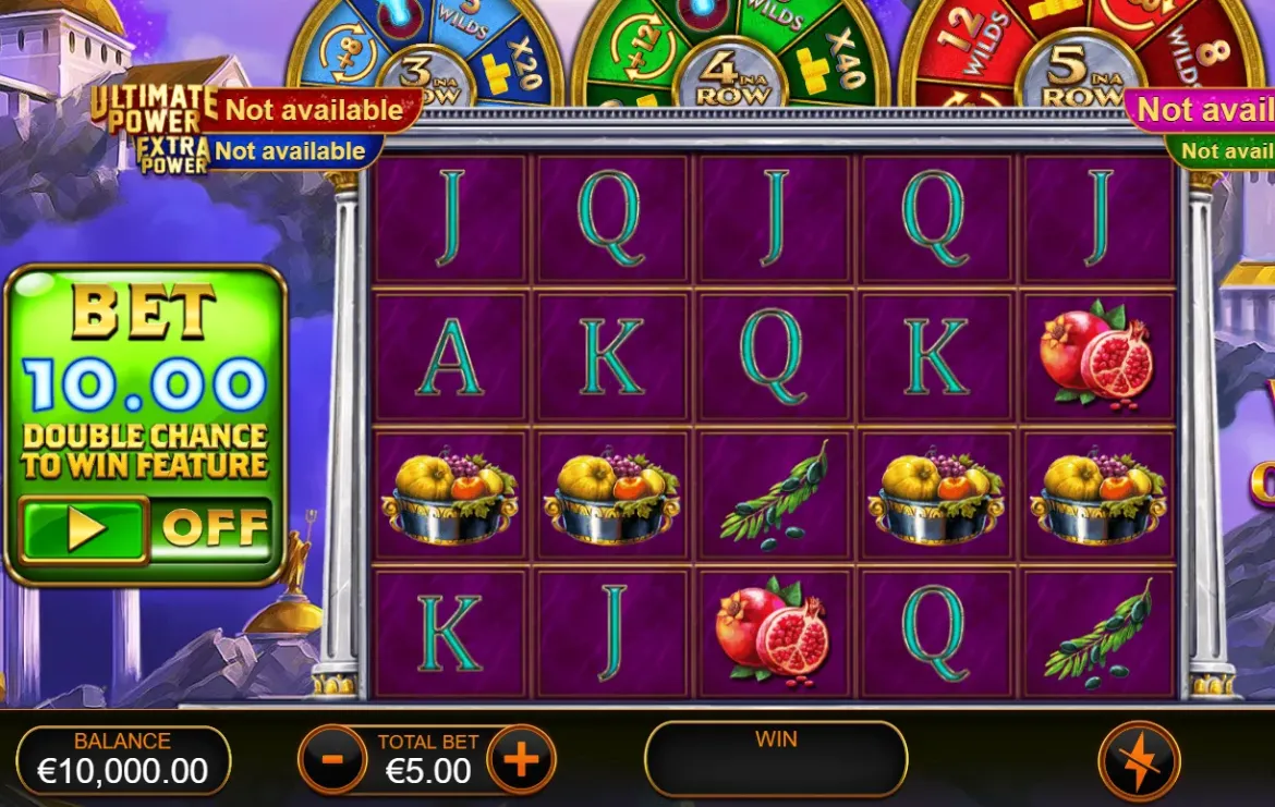 The Feature Bet is an optional mode designed for players eager to boost their chances of triggering the main bonus round. By activating the Feature Bet, your stake is doubled, but this doesn’t alter the paytable or symbol values. Instead, it significantly increases the likelihood of landing the Wheels of Olympus feature during regular gameplay. This option is perfect for those who prefer a more volatile and bonus-driven experience, as it can lead to more frequent access to the game’s most lucrative features. The Feature Bet is easy to toggle on or off, allowing players to tailor their session to their preferred style. While it does increase the cost per spin, the potential for more frequent bonus rounds and bigger wins can make it a compelling choice for those who enjoy high-action slots.
