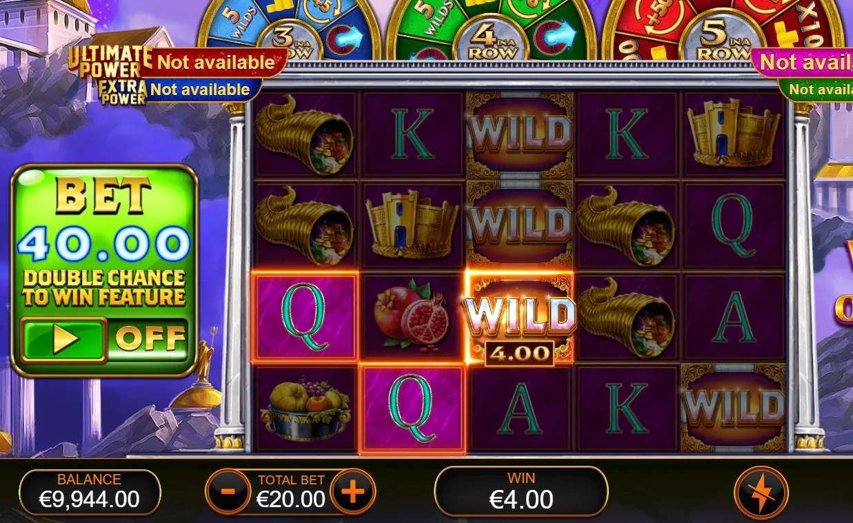 The slot features a wild symbol that substitutes for all regular symbols, helping to complete winning combinations. There is no traditional scatter symbol, instead, the game introduces golden symbols. On any spin, random symbols can be highlighted in gold. Landing three or more adjacent golden symbols on the same row triggers the Wheels of Olympus feature, which can award instant cash prizes, free spins, or respins with added wilds. The Feature Bet option is available, doubling your stake to increase the chances of activating this bonus round, though it does not alter the paytable values.